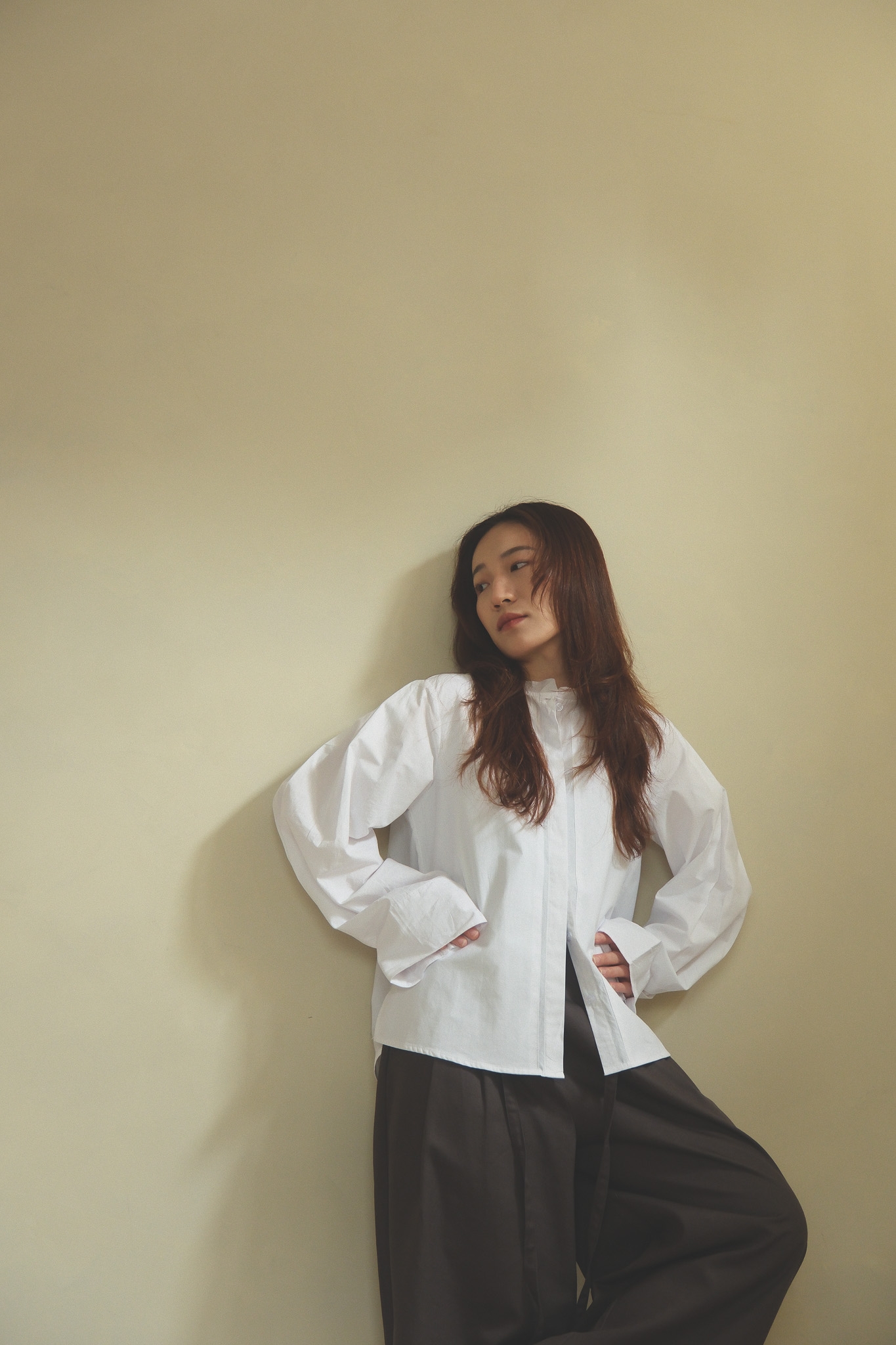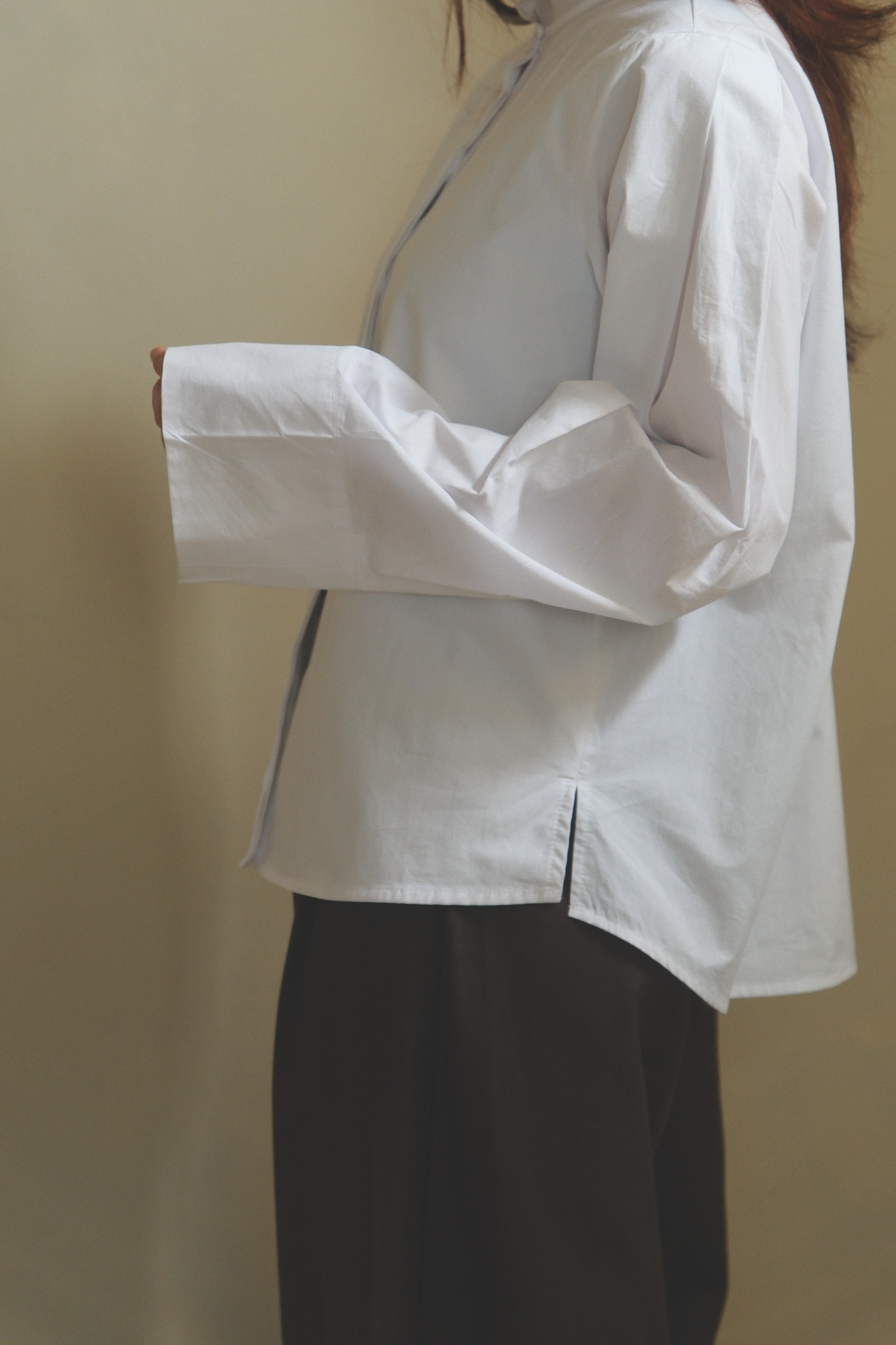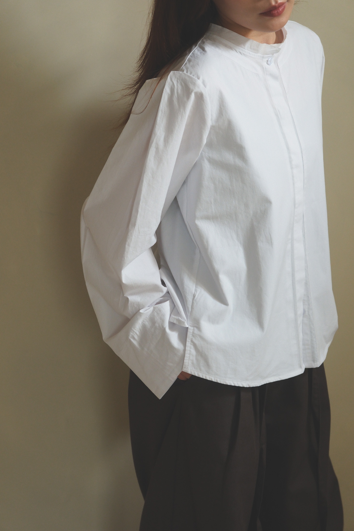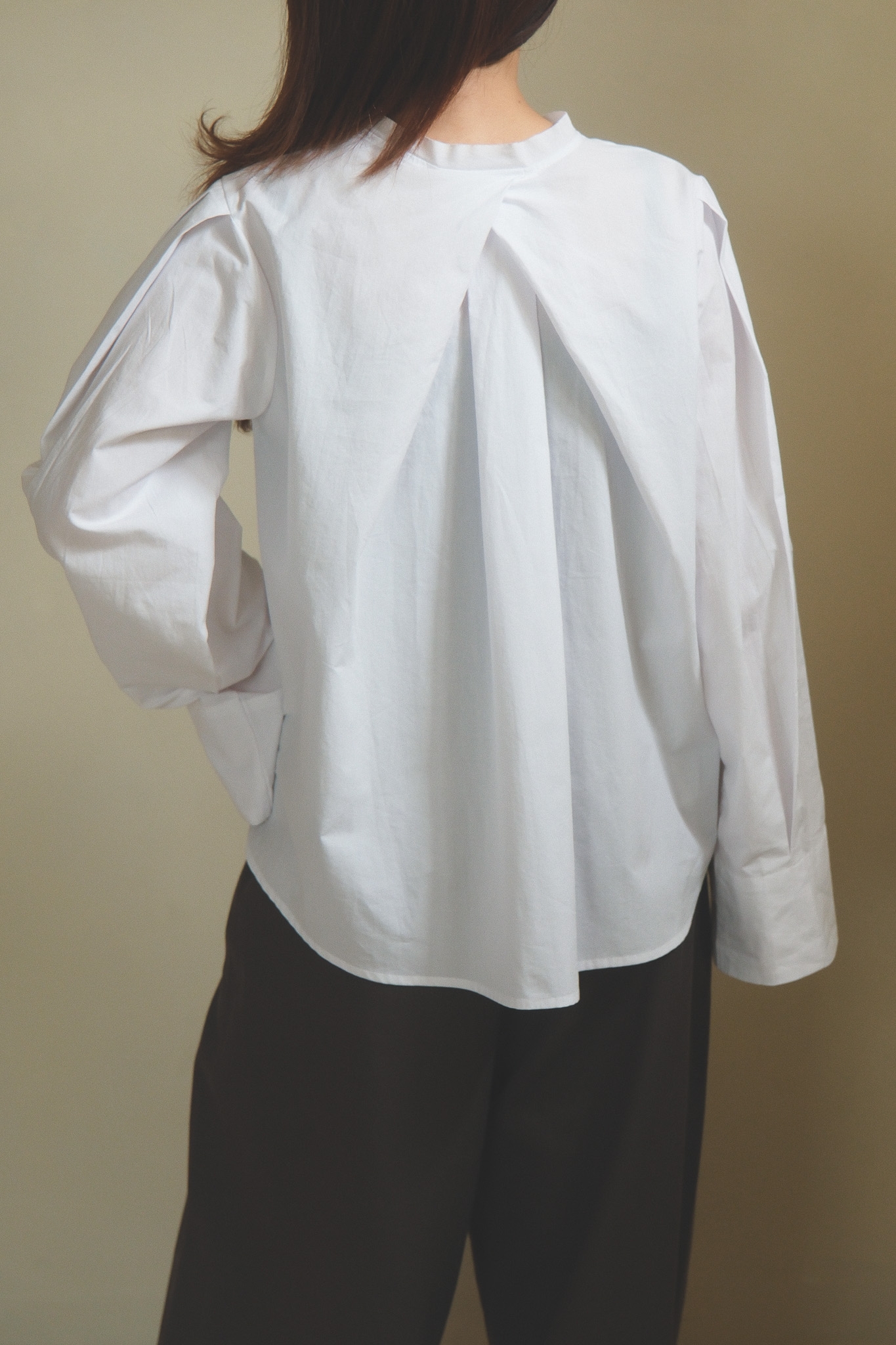 以簡潔俐落的白襯衫為基底,領口做了更輕盈的線條處理,少了制式襯衫的拘謹感,多了一點柔和、安靜卻很有態度的味道。 袖身保留了適度的空氣感,穿起來不會過於貼身,輪廓自然立體,看起來精神不呆板~ 正面乾淨、好搭,背面則用立體摺線帶出份量與層次,讓白襯衫不只是基本款,而是一件從前面看到側面、再到轉身背影都很耐看的單品。 尤其怕看起來很厚的女生,這件的剪裁能讓整體看起來俐落又輕盈! 單穿時清爽俐落,搭牛仔褲會是很輕鬆、不隨便,搭配寬褲、長裙,或拿來做層次穿搭,也都能穿出更有造型感的氣質。