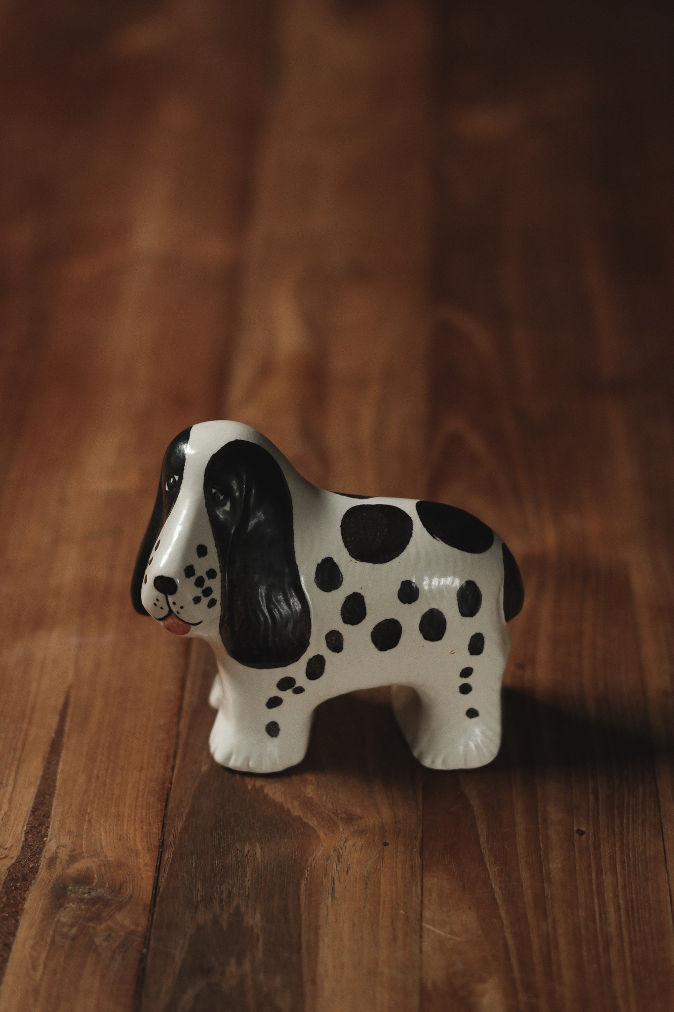 它是一隻帶著些許慵懶感、眼神卻又有點銳利的史賓尼犬,身上的斑點低調分布,連微微垂落的尾巴都讓整體多了一種若有所思的氣質