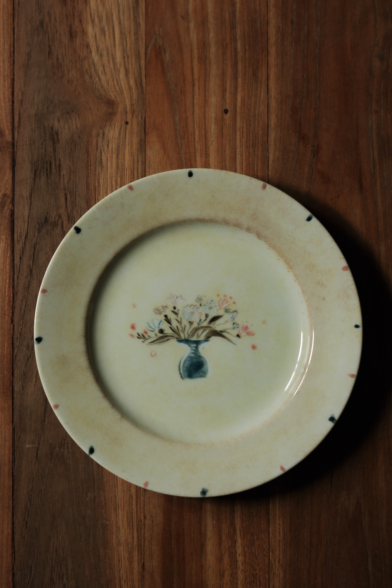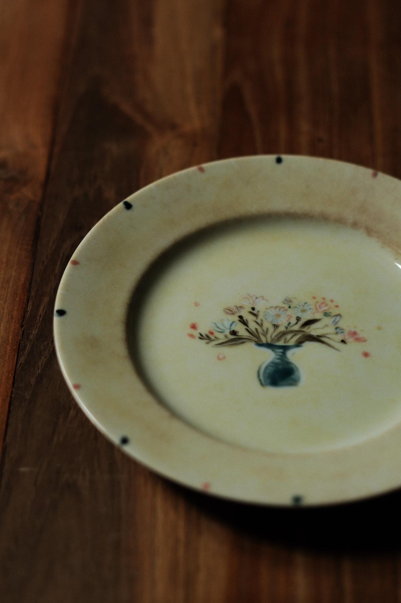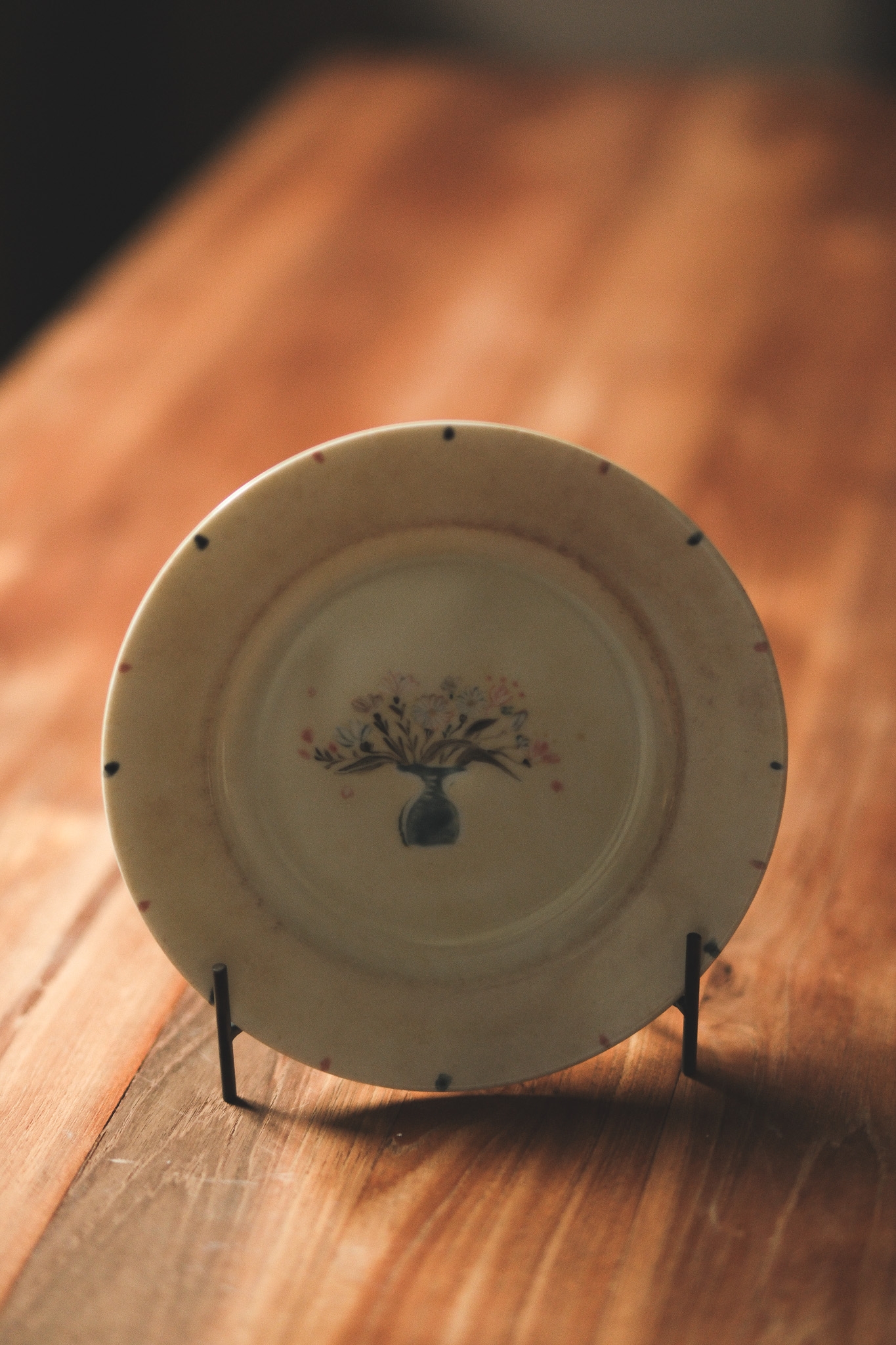 盤面中央描繪一只藍色小花瓶,隨性綻放的花束像是剛被放進器皿中,帶有自然流動的生命感。柔和的米白底釉上點綴細緻色彩,邊緣不規則的小點裝飾,增添一點童趣與手作溫度。