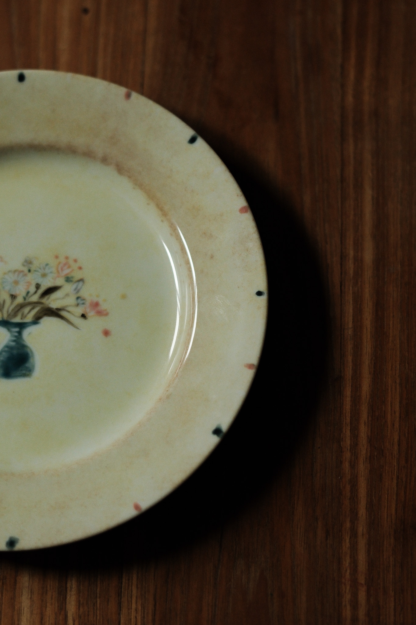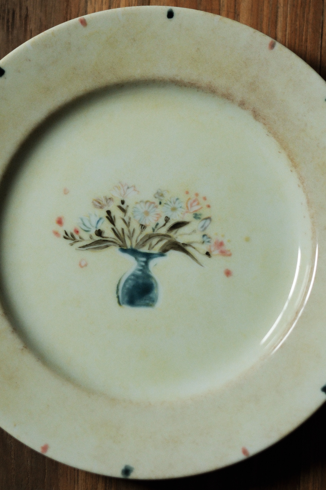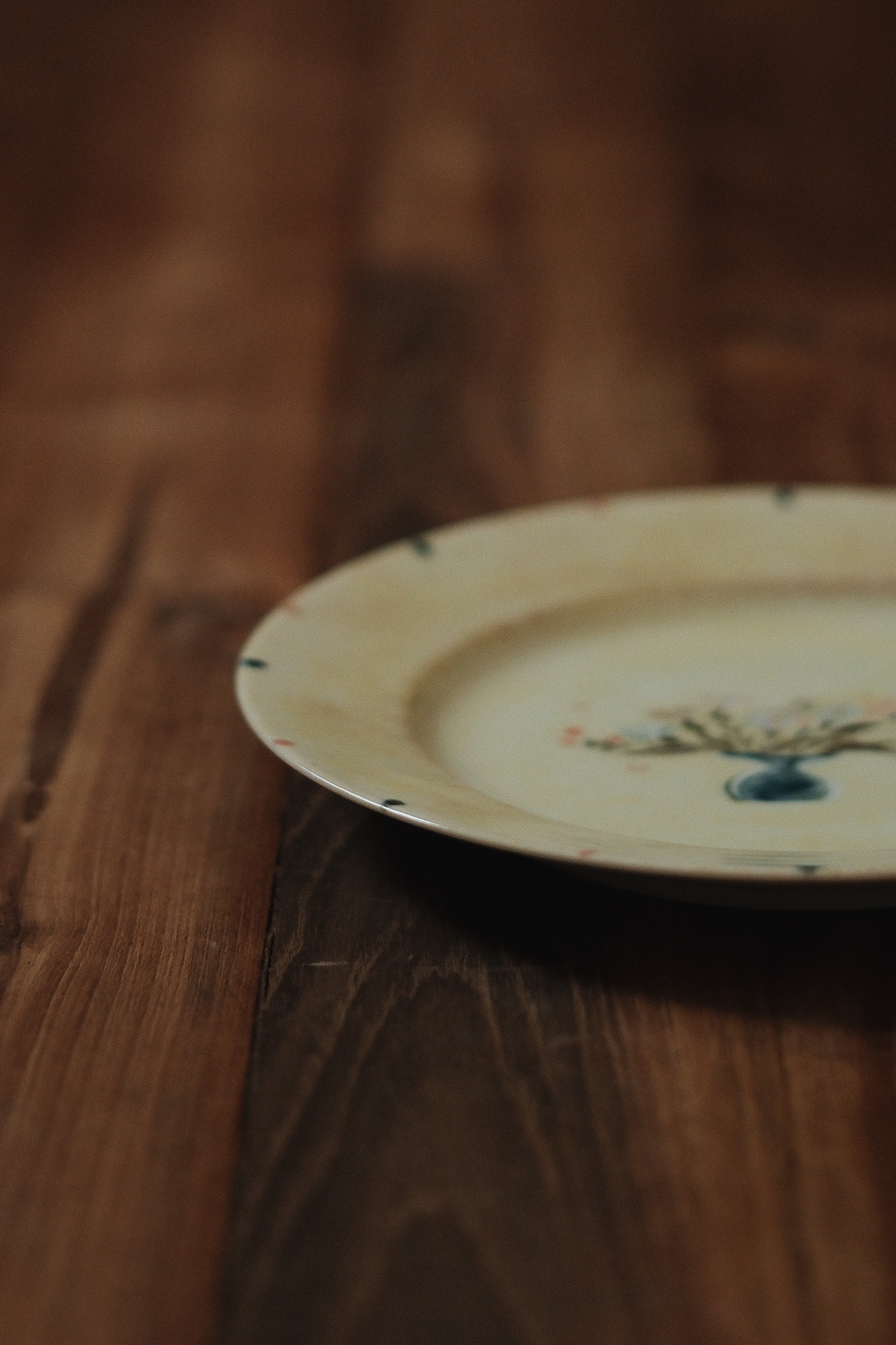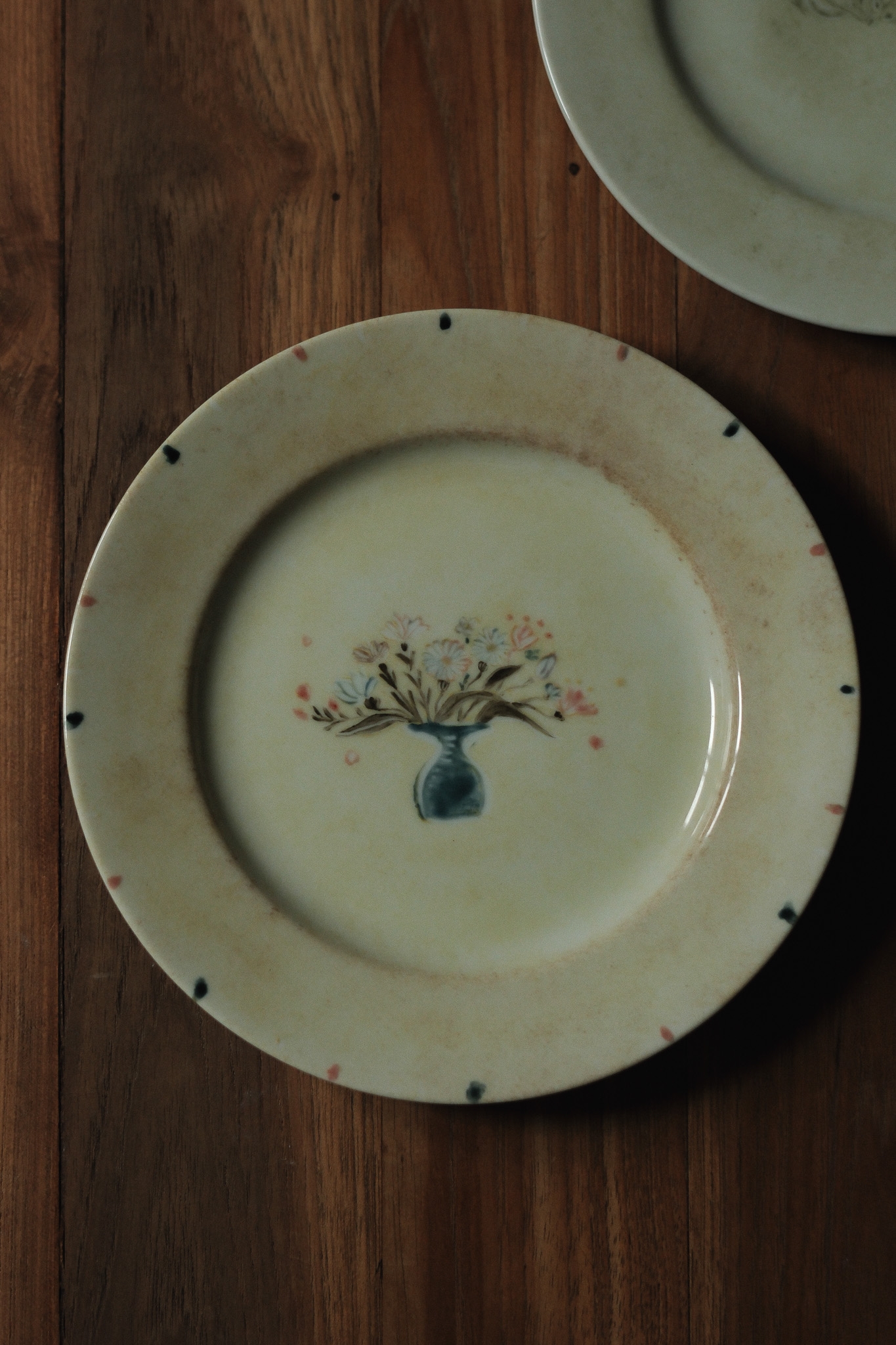 盤面中央描繪一只藍色小花瓶,隨性綻放的花束像是剛被放進器皿中,帶有自然流動的生命感。柔和的米白底釉上點綴細緻色彩,邊緣不規則的小點裝飾,增添一點童趣與手作溫度。