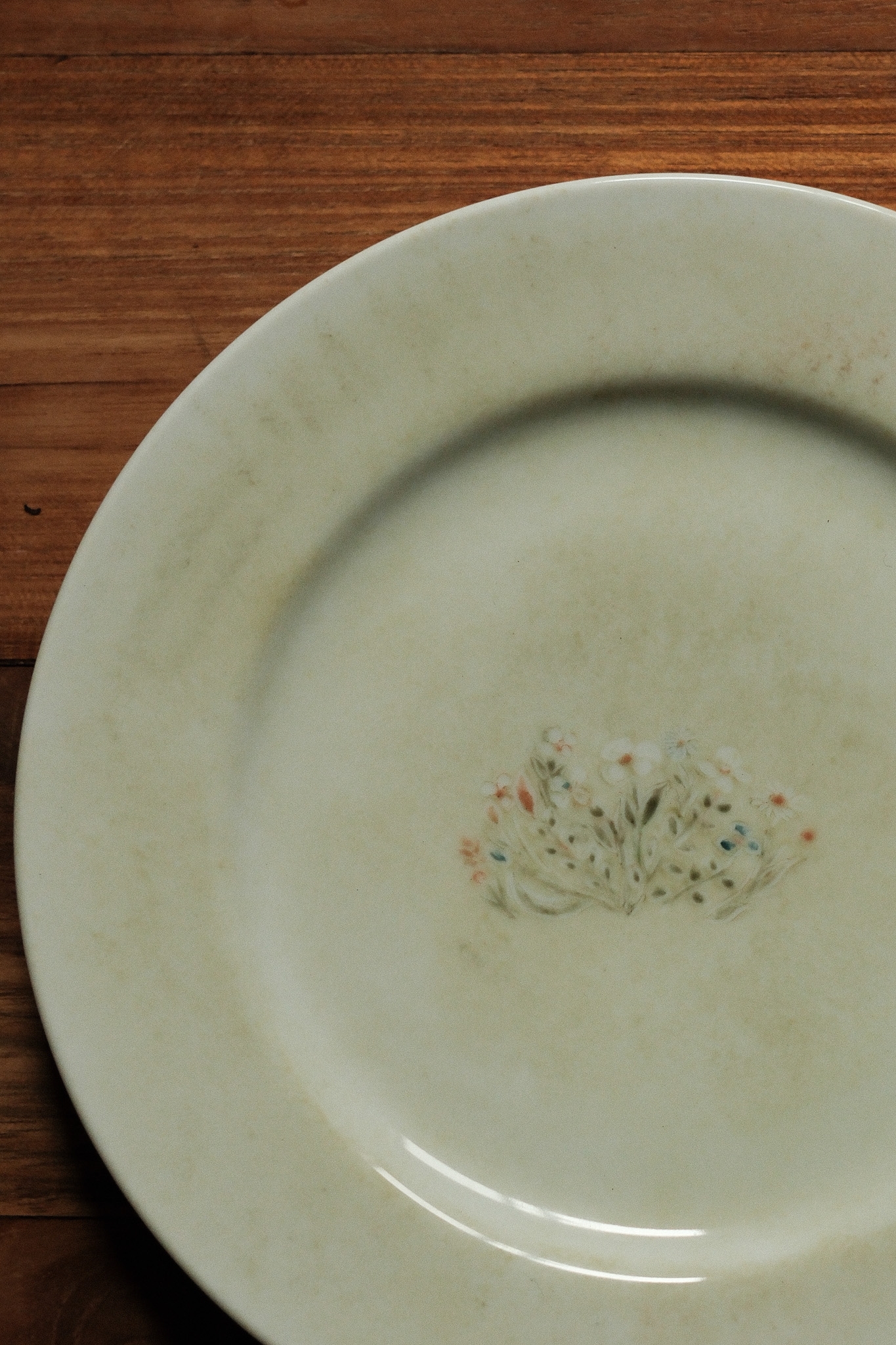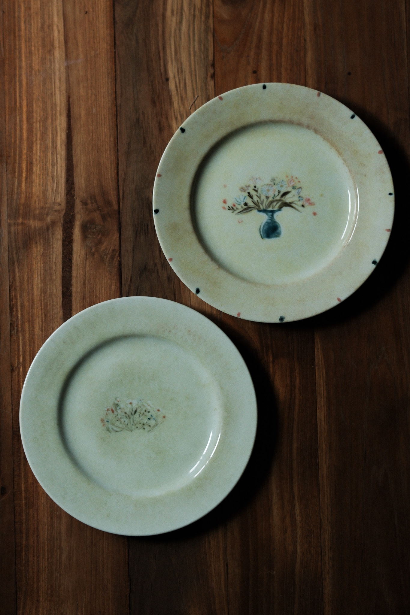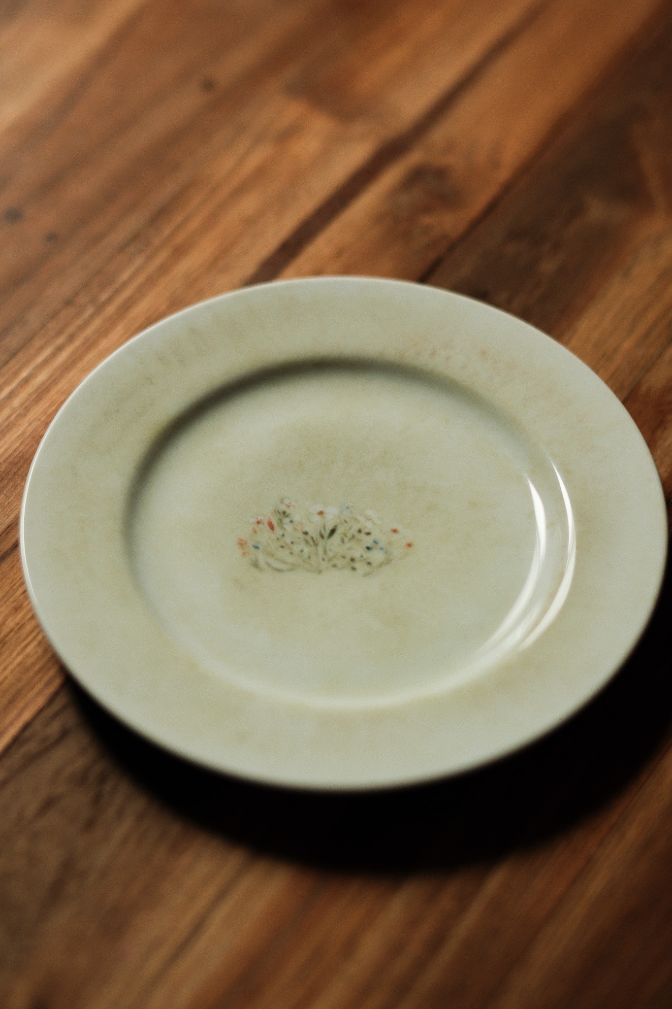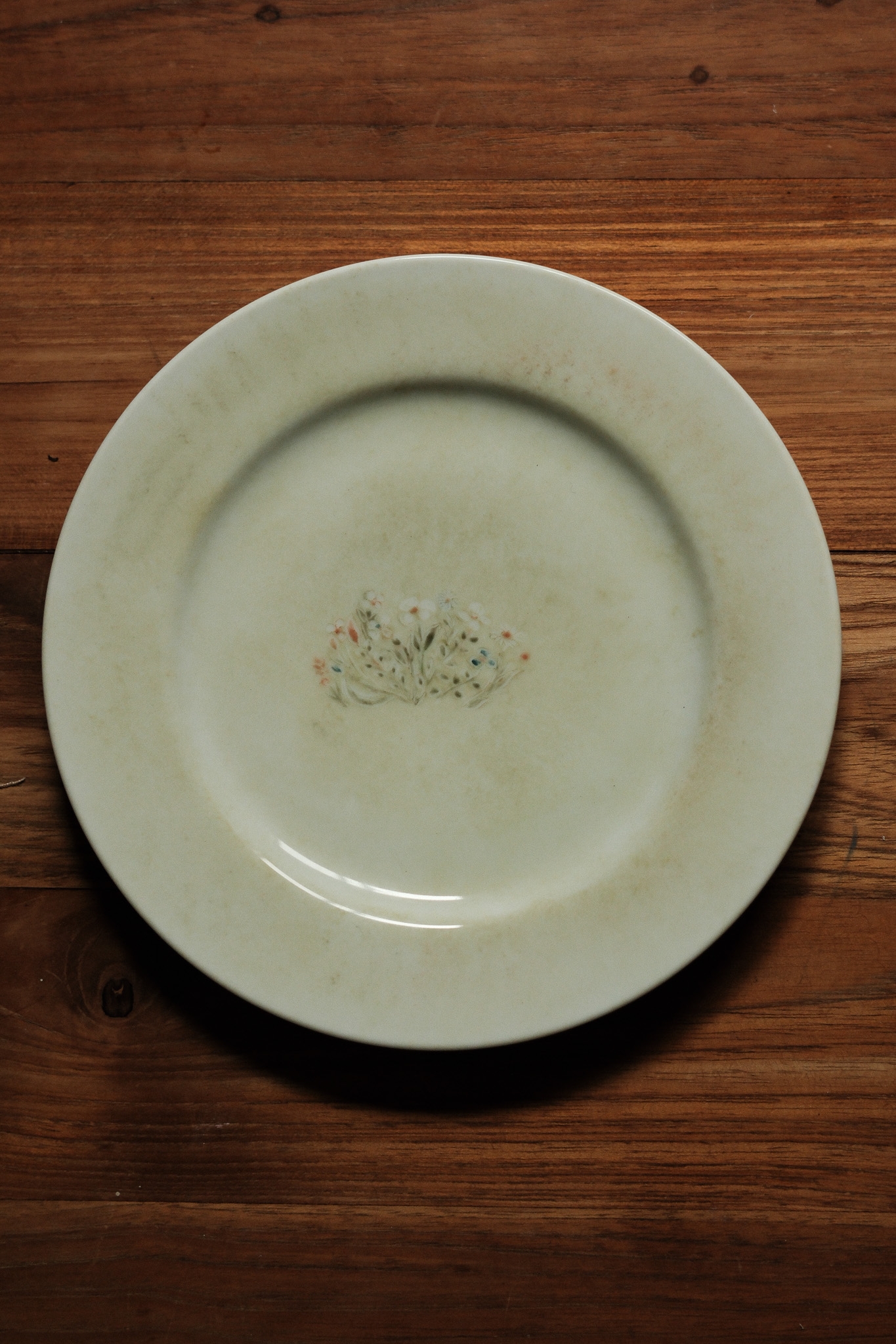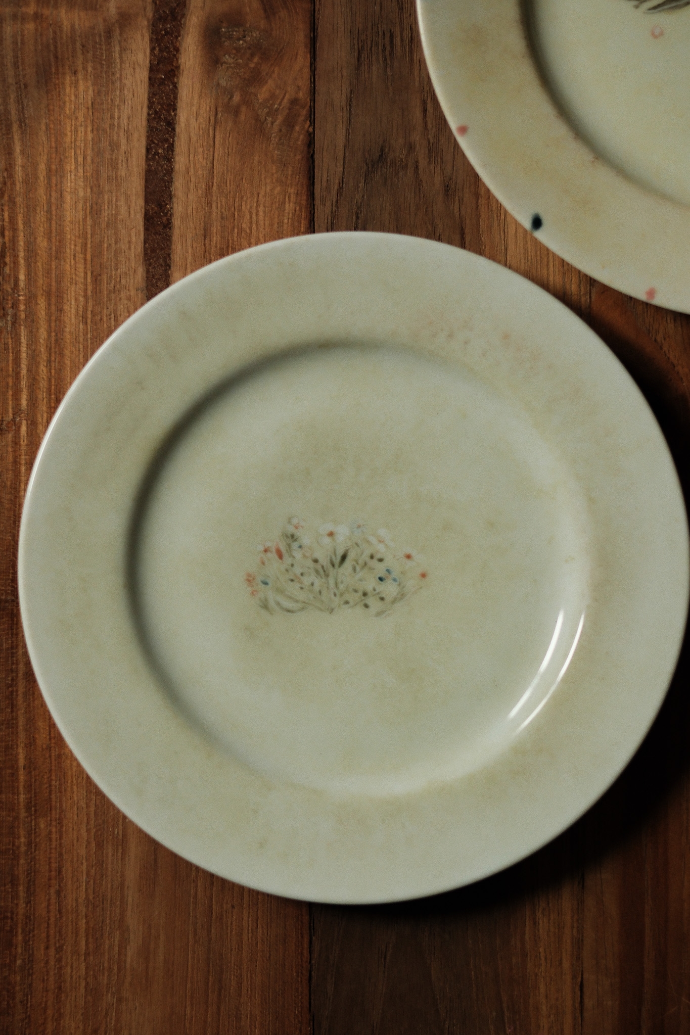盤面中央以輕柔筆觸描繪一束低矮綻放的野花,線條細膩且帶有留白感,呈現出更為安靜、內斂的氣質。淡雅的色彩與霧感釉面相互呼應,讓整體顯得柔和且耐看。